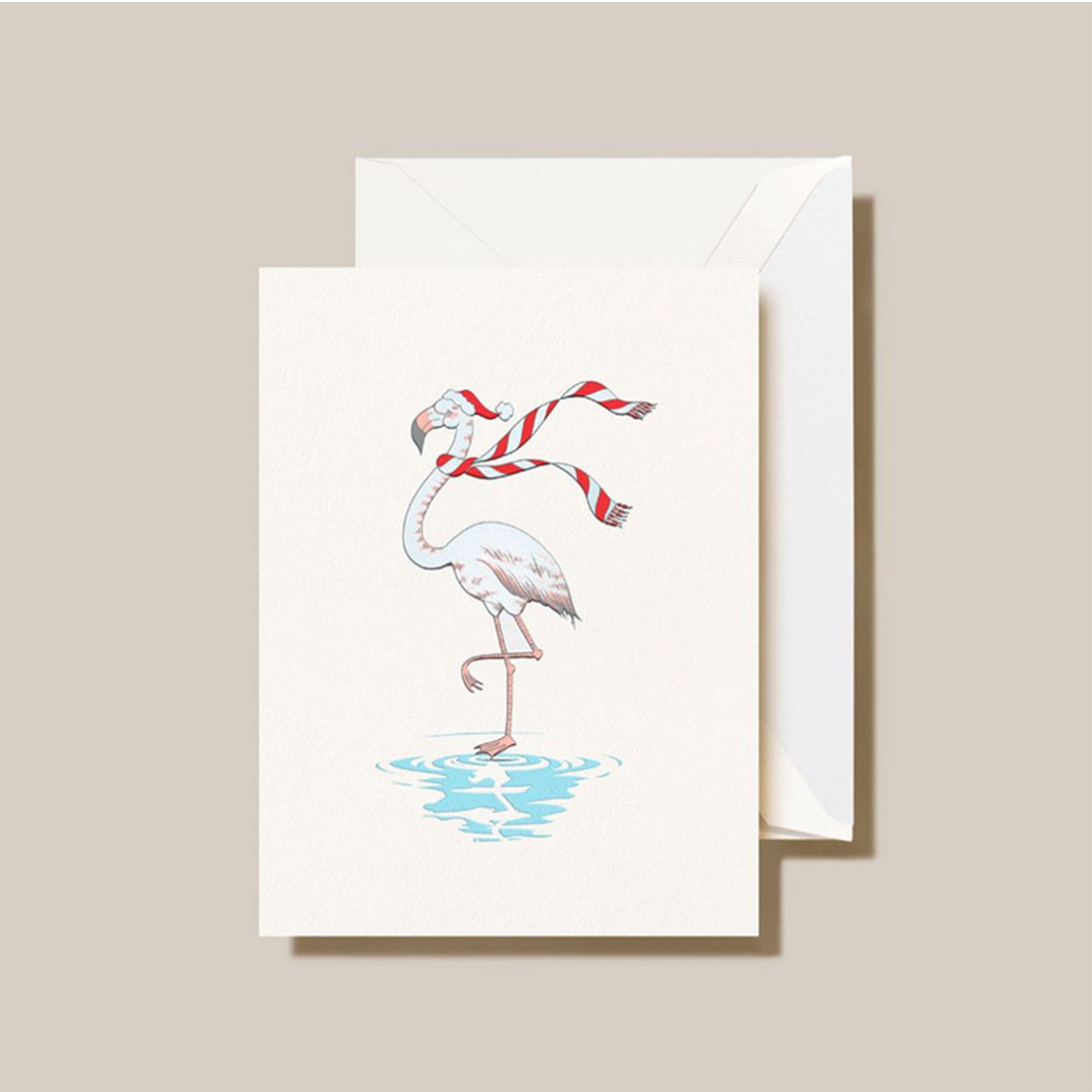 Add a playful splash of holiday cheer with the Festive Flamingo Greeting Card. This charming card features a winter-clad flamingo brought to life by our exquisite hand-crafted engraving, perfectly blending festive elegance with simplicity. The design captures the joyful spirit of the season in a way that’s both unique and fun. Inside, the card unfolds to reveal the heartfelt message, "Merry Christmas. Warmest holiday wishes throughout the year," printed in bright red ink to brighten anyone’s day. Included is a matching envelope lined with shimmering pearl, adding a touch of sparkle and sophistication. Ideal for sending to loved ones or friends, this card makes your holiday greetings stand out with warmth, whimsy, and style that lasts all season long.