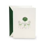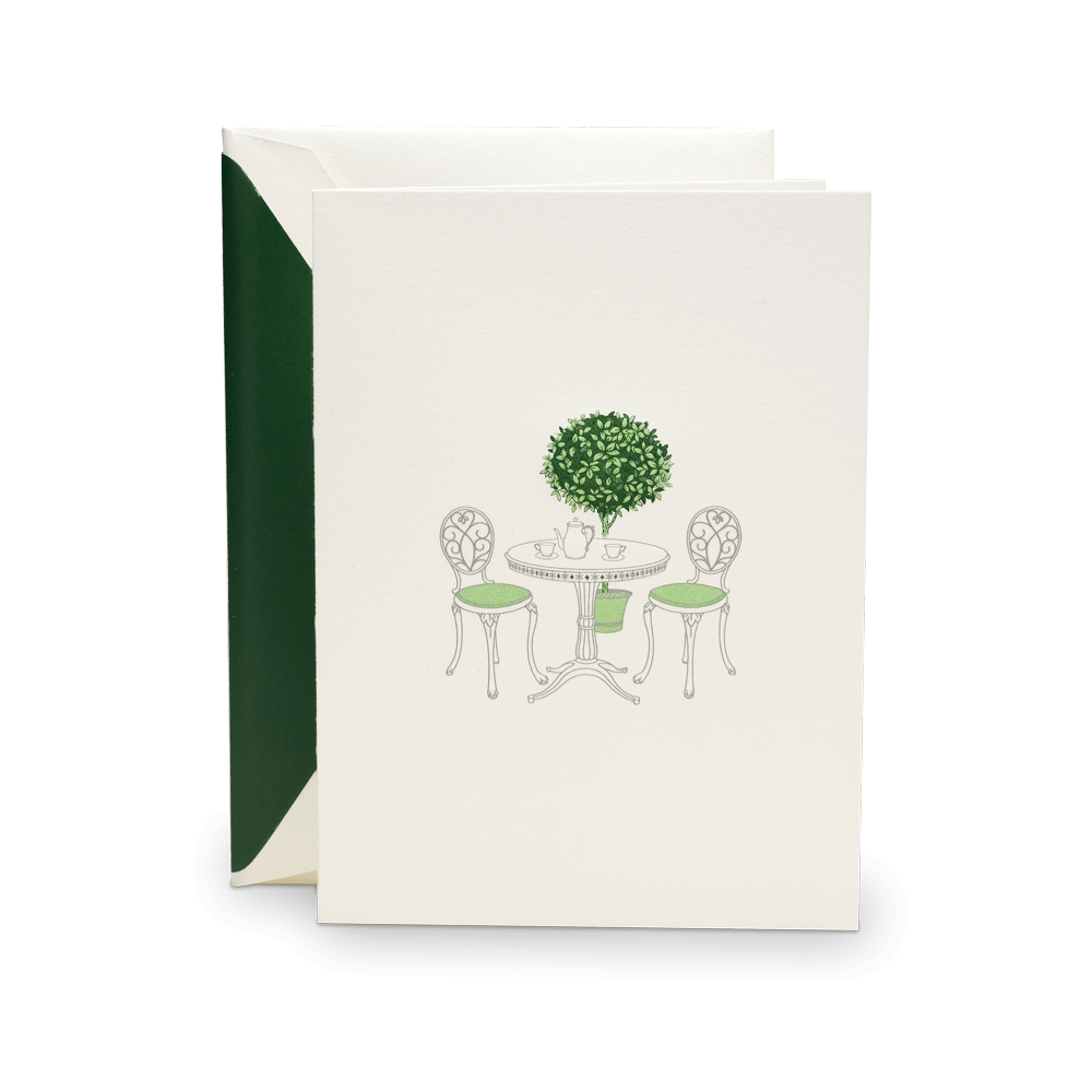 Capture the charm of an intimate garden retreat with this pearl white folded note. The front features an exquisitely engraved bistro scene, complete with a tea setting and a stately topiary, evoking timeless elegance. Paired with a matching green-lined envelope, this stationery is perfect for sending thoughtful messages, quick invitations to brunch, or thank you notes. A refined choice for those who appreciate the art of sophisticated correspondence.