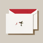 Spotting a hummingbird is a cheerful encounter that many consider to be a sign of good luck. A delicately engraved rendering of this favorite garden visitor, fluttering near a trio of red flowers, is a perfect way to spread cheer to your loved ones. With a matching red envelope liner and plenty of space inside to send your well wishes, this is the kind of note you save to read again later.