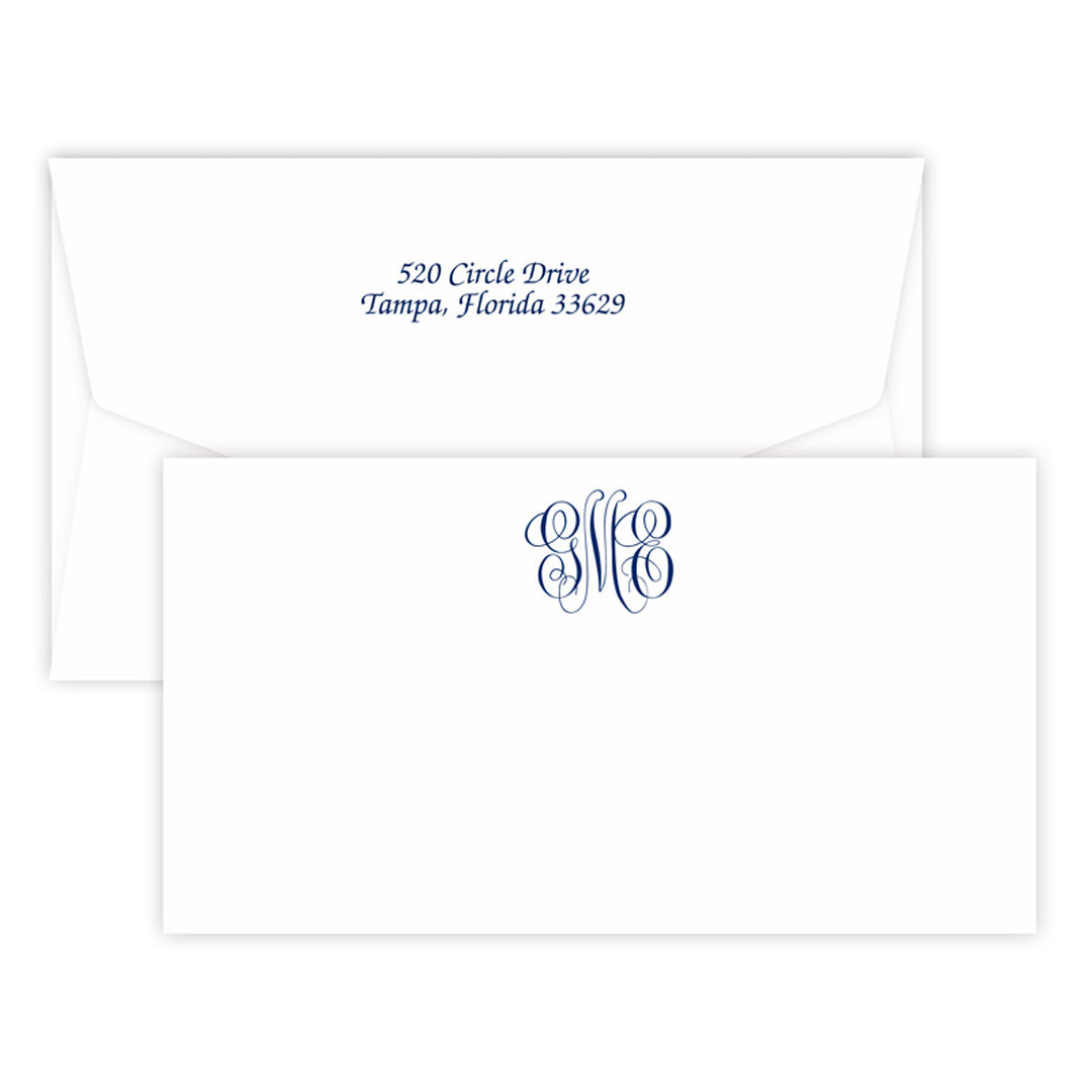 The Chesapeake Cards represent our largest flat correspondence cards. The Delavan Monogram Chesapeake Card with Raised Ink allows you to select from 10 distinct monogram styles and 8 raised ink colors. This generously sized, triple-thick card is available in either horizontal or vertical orientation. Monogram designs in the Delavan Collection include Classic, Circle, Firenze, Paris, Elise, Whitlock, Madrid, Sienna, Roma, and Diamond. Customize your stationery with options for paper color (White or Ivory), border color, and 10 hand-inserted envelope lining colors. Envelopes also feature a return address printed in matching ink.