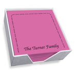 The Family Arch Memo Square - Carnival with holder allows a choice between 5 colorful papers with your personalization printed in black, matte ink. This item features a bottom line (in your choice of 10 lettering styles) and up to 10 individual names that create a border around the notepad.