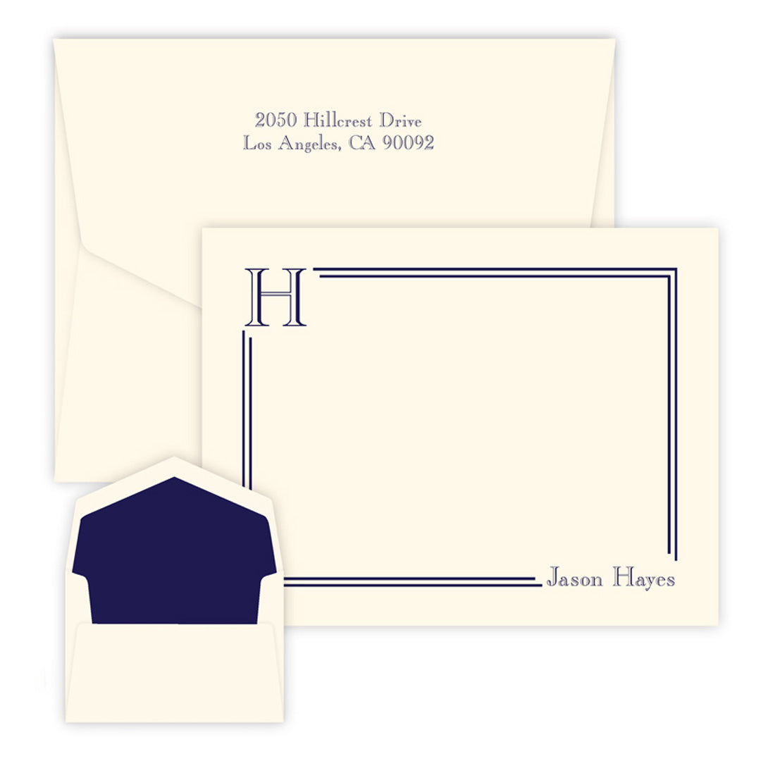 Elevate your personal correspondence with the South Hampton Initial Correspondence Card, designed for those who appreciate refined simplicity. Each card showcases your chosen initial and a single line of text in a classic Roman Serif open-face font, printed on flat, triple-thick paper for a substantial feel. The raised ink border, perfectly matched to your selected ink color, adds a tactile dimension that enhances the card’s elegance. Choose from eight vibrant ink colors and two premium paper stocks—white or ivory—to suit your style. The set includes 25 personalized cards paired with matching Pinnacle envelopes, featuring bold, hand-inserted linings available in ten colors. Optional return address printing in coordinating ink and font completes this sophisticated stationery, making it ideal for impactful, memorable communication. Design your unique set today to express your identity with expert craftsmanship.