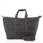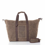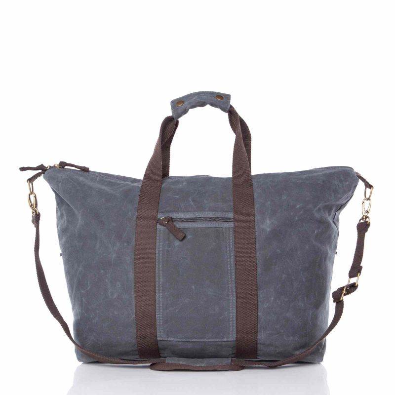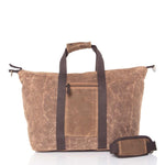 Pack your essentials for an overnight trip inside this rustic yet sophisticated Waxed Canvas Voyager Weekender. This large weekender style duffel bag is made from waxed canvas and features contrasting deep brown accents and trim, heavy duty webbing, two top handles, an adjustable detachable shoulder strap, and bottom antique brass stud feet. It includes a top zip closure and a fully lined interior.