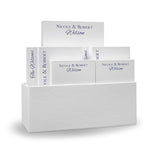 The Executive 7-Tablet Set - White with Linen holder features a combination of one line of text personalization for 5 tablets and up to five initials on the 2 small tablets. This item now offers your choice between 10 font styles and 8 matte ink colors on our exceptional white paper. Includes four different tablet sizes.