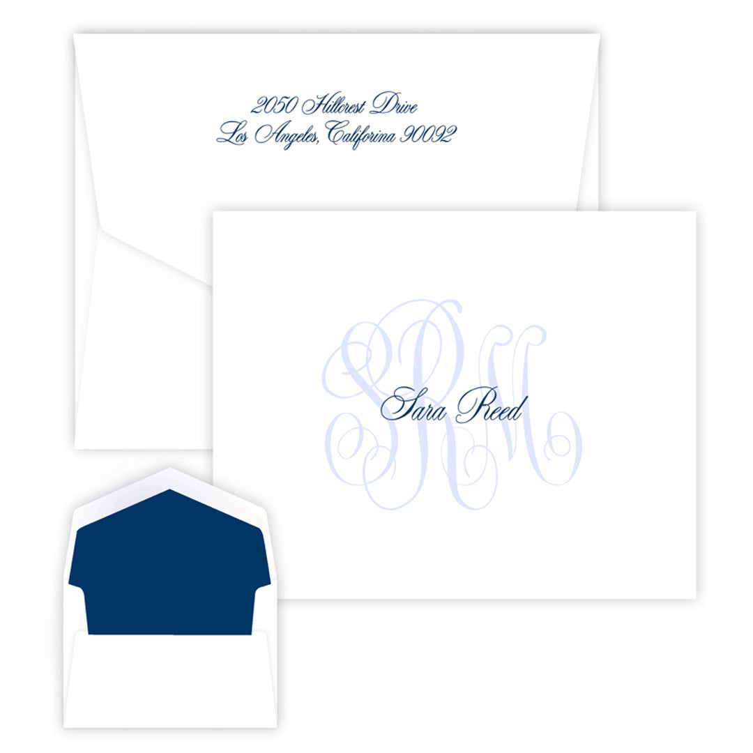 The Rosedale Monogram Folded Note Cards elevate everyday correspondence with their refined, tactile design. Each double-thick card features your Classic Monogram in a subtle watercolor screen beneath your name, rendered in raised ink for a distinctive visual and textural effect. Customize your set with 8 ink colors, 6 font styles, 7 border options, and 2 paper tones, plus optional envelope liners and return-address printing. This set includes 25 notecards paired with matching Pinnacle envelopes. Create a personalized stationery collection that reflects your sophisticated style.