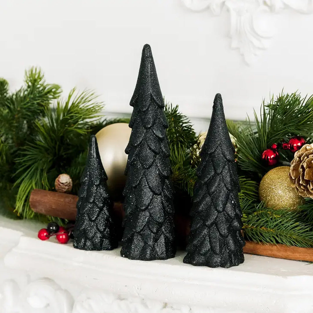 This beautiful tree set is a charming winter decoration to set around your home. With their unique sparkly, monochromatic coloring, the inexpensive black pine trees are a whimsical décor element you can leave out throughout the winter and holiday season. Not only can they accent your Christmas decorations, but they can enhance the décor in your home even past the last snowfall. Each tree is a different height, making it easy to arrange the three inexpensive trees in creative ways that will draw the eye. Place them on your coffee table, side tables, the fireplace mantel, or use them as part of your dining table centerpiece. The uses for the simple but charming tabletop pine tree set are practically endless. You could even use them as additional decorative items in your decorative winter village to set the scene.